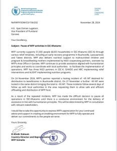 The World Food Program (WFP) has suspended all humanitarian operations in Somalia’s SSC-Khaatumo region following two significant looting incidents this month. The theft of critical food aid has left tens of thousands of vulnerable people without assistance in one of Somalia’s most fragile areas.