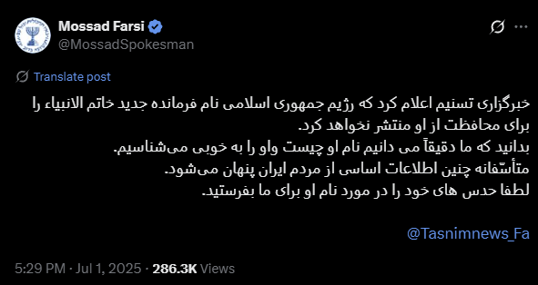The tweet directly referenced a Tasnim News Agency report earlier the same day, which stated that the identity of the new commander of Iran’s Khatam al-Anbiya Central Headquarters would remain classified due to the assassinations of the last two commanders—believed to have been carried out by Israeli airstrikes.
