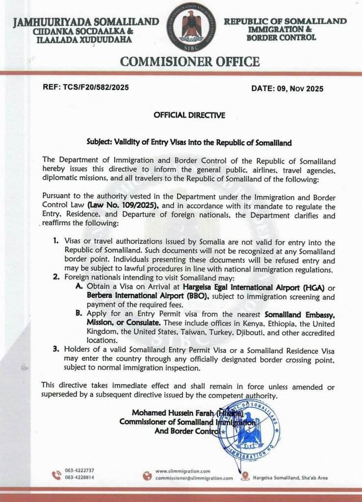 The directive marks one of the clearest and most assertive statements yet regarding Somaliland’s independent border and visa regime.